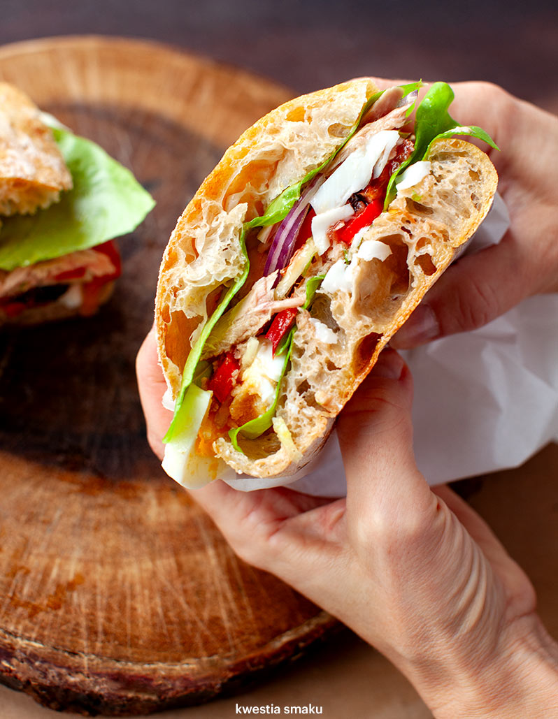 Ciekawostką jest w tej kanapce to, że po przekrojeniu bułkę skrapiamy oliwą oraz octem winnym. Także dlatego jest bardzo soczysta. Można ją podawać od razu po zrobieniu, ale też sprawdzi się na pikniku, wówczas zawijamy bułkę w pergamin a następnie szczelnie w folię aluminiową.