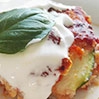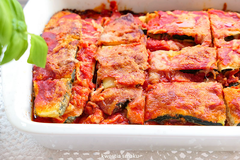 Zapiekane warstwy panierowanych plastrów cukinii przełożonych tartym serem i passatą pomidorową z bazylią.