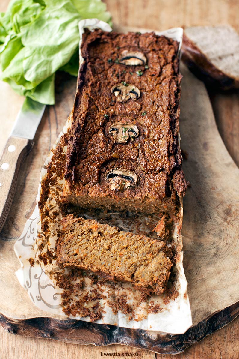 Wegański i bezglutenowy pasztet z kaszy gryczanej, zielonej soczewicy i pieczonych warzyw korzeniowych oraz pieczarek. Z małą ilością oleju.