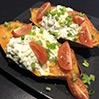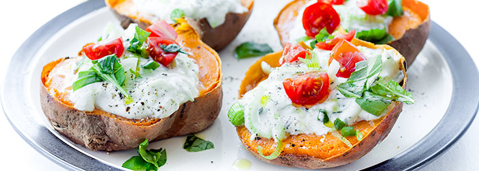 Bataty pieczone w całości, następnie przekrojone na połówki i podawane z tzatziki - greckim sosem jogurtowym z dodatkiem świeżego ogórka. Danie lekkie, wegetariańskie, idealne na letnią porę. Słodkie i mięsiste bataty świetnie współgrają z kwaskowatym jogurtem i orzeźwiającym ogórkiem. Z dodatków polecam szczypiorek oraz świeże pomidorki koktajlowe. Sprawdzą się też pokrojone czarne oliwki.