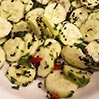 - Ogórki umyć, osuszyć i obrać, pokroić na cienkie plasterki. Wymieszać z posiekanym szczypiorkiem, sosem oraz posypać sezamem.