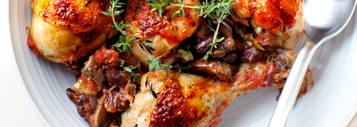 Danie, które nie wymaga zbyt dużo nakładu pracy i wyszukanych składników a efekt jest ciekawszy niż w przypadku zwykłych pieczonych podudzi. Podudzia przed pieczeniem podsmażamy na patelni w celu pozbycia się nadmiaru tłuszczu i uzyskania chrupiącej i cienkiej skórki. Na tej samej patelni podsmażamy następnie dodatki (pieczarki, cebulę czerwoną i czosnek) i mieszamy z fasolką oraz pomidorami z puszki. Całość przekładamy do naczynia do zapiekania, dodajemy podudzia i pieczemy aż mięso będzie miękkie. Z ziół wybrałam tymianek. Mięso doprawiłam tylko solą i pieprzem, ale możecie też użyć swojej ulubionej przyprawy do kurczaka.
