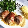 Danie na rodzinny obiad dla kilku osób. Klasyczne smaki w nieco nowocześniejszej odsłonie. Roladki z polędwiczki nadziewane suszonymi śliwkami maczanymi w brandy, zawinięte w kawałeczek szynki parmeńskiej i pieczone w piekarniku.
