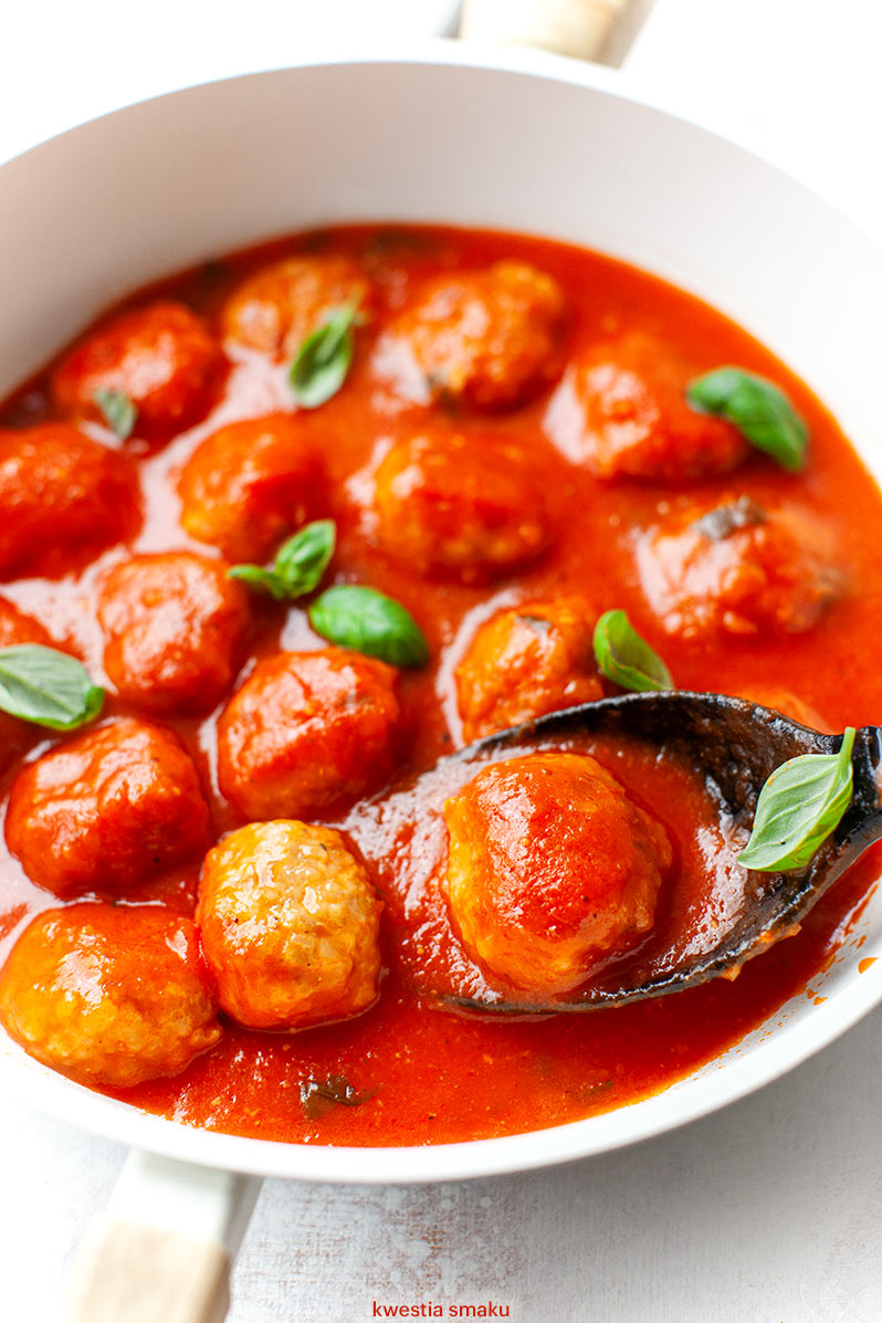 Mięsne pulpeciki z dodatkiem ryżu, gotowane w sosie pomidorowym z bazylią
