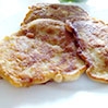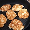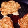 - Wykładać po około łyżce ciasta i po 3 plasterki jabłek na 1 placka na rozgrzany tłuszcz na patelni i smażyć przez około 1,5 minuty na złoty kolor. Przewrócić na drugą stronę i powtórzyć smażenie.