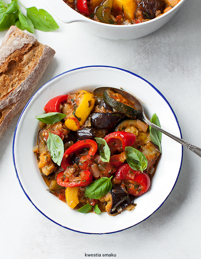 Ratatouille czyli francuski "gulasz z warzyw" - wegetariańska potrawa z bakłażanów, cebuli, czosnku, pomidorów, cukinii i papryki, z dodatkiem natki pietruszki, bazylii i tymianku. Gotowana głównie latem w sezonie na świeże warzywa ogrodowe. Przygotowanie jest proste, warzywa najpierw obsmaża się na patelni na oliwie, później gotuje aż będą miękkie, ale ciągle jędrne. Ratatouille polecam ugotować z dodatkiem świeżych pomidorów, ale z gotową passatą pomidorową (przecierem) też będzie OK.