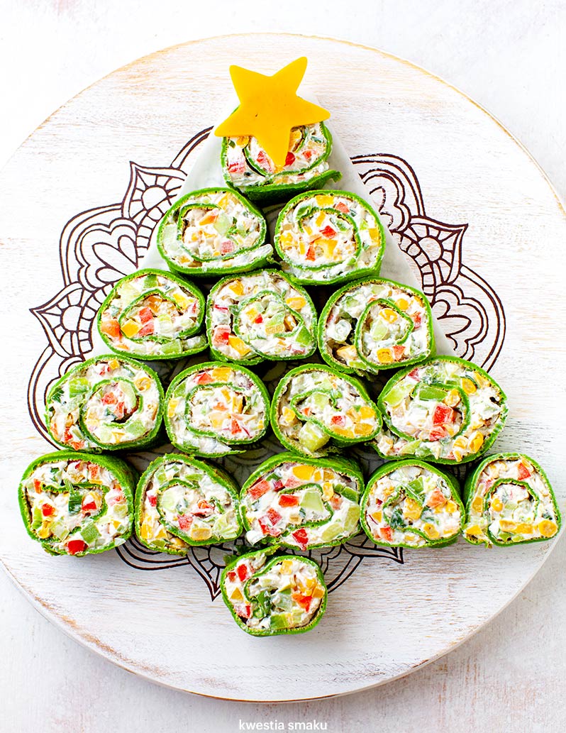 Ciekawe roladki wegetariańskie z zielonych naleśników (z dodatkiem szpinaku), z puszystym nadzieniem z serka z dużą ilością pokrojonych warzyw: kolorowej papryki, kukurydzy i ogórka. Ułożone w kształt choinki, co oczywiście można pominąć już po okresie świąteczno-noworocznym. Jedną paprykę np. zieloną można zastąpić awokado.