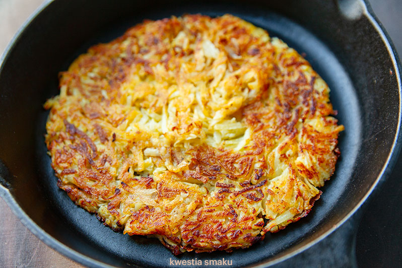 Sama spotkałam się z wersją z ziemniakami startymi łącznie ze skórką i podawanymi bardzo rustykalnie w żeliwnych naczyniach. Być może ziemniaki były pieczone na surowo, ale do końca nie jestem tego pewna. Częściej spotyka się bardziej zwyczajne Rösti z ziemniaków podgotowanych i obranych.