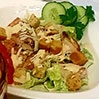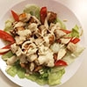 Sałatka Cezar z sałaty rzymskiej z dodatkiem piersi kurczaka, z sosem majonezowym, grzankami i tartym parmezanem.