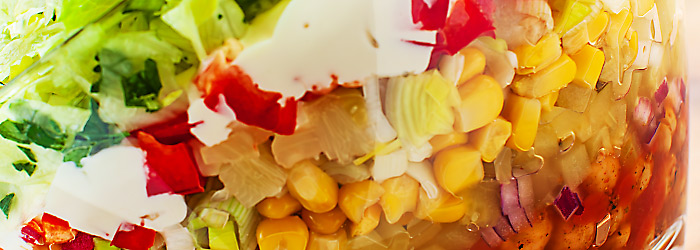 - Ułożyć kolejną warstwę sałatki z obranych i pokrojonych w kosteczkę ogórków kiszonych a następnie z odcedzonej kukurydzy.