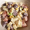 - Dodać pokrojoną w kosteczkę paprykę i pokrojony w małą kosteczkę ser żółty. Dodać majonez, doprawić solą i pieprzem, wymieszać. Przełożyć do czystej salaterki, udekorować natką pietruszki.