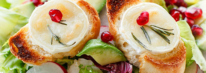 Sałatka z awokado, granatem oraz grzankami z kozim serem i rozmarynem