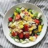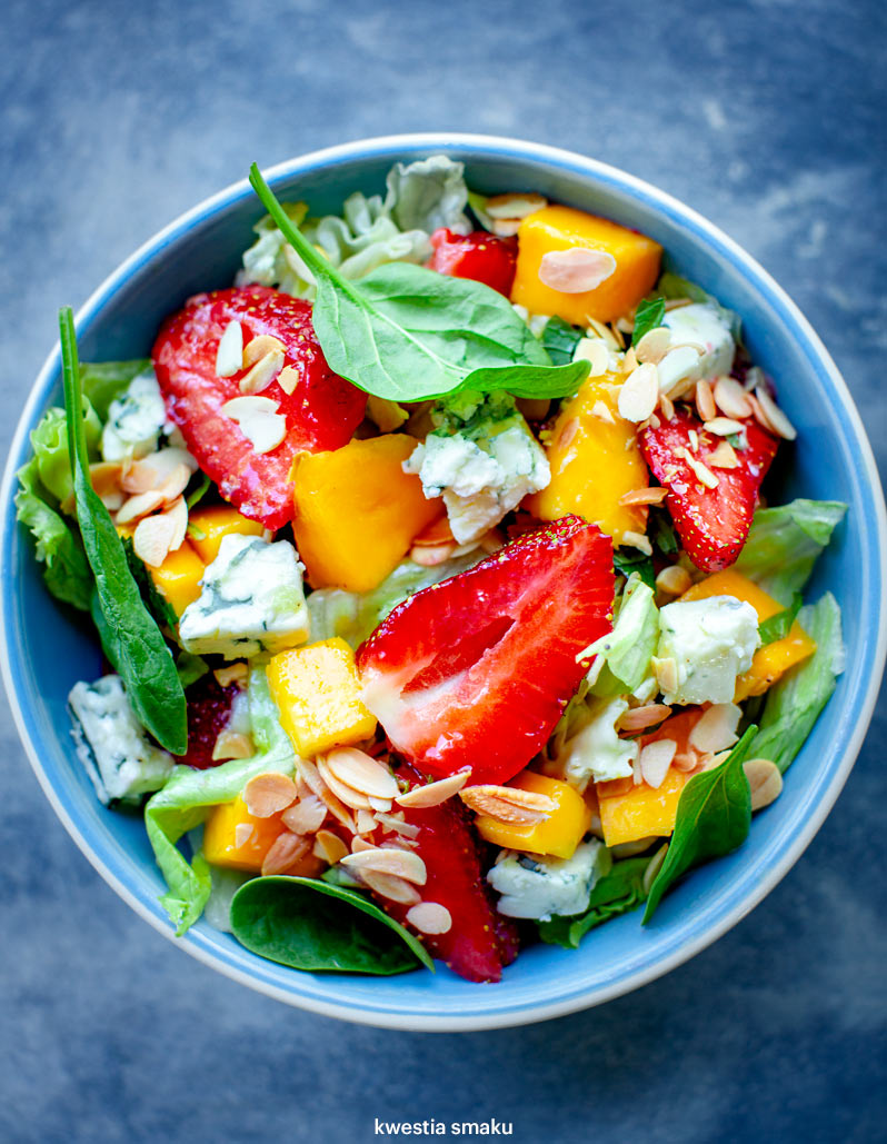 Wspaniała sezonowa sałatka z truskawkami, mango i serem z niebieską pleśnią. Z płatkami migdałów i winegretem imbirowym.