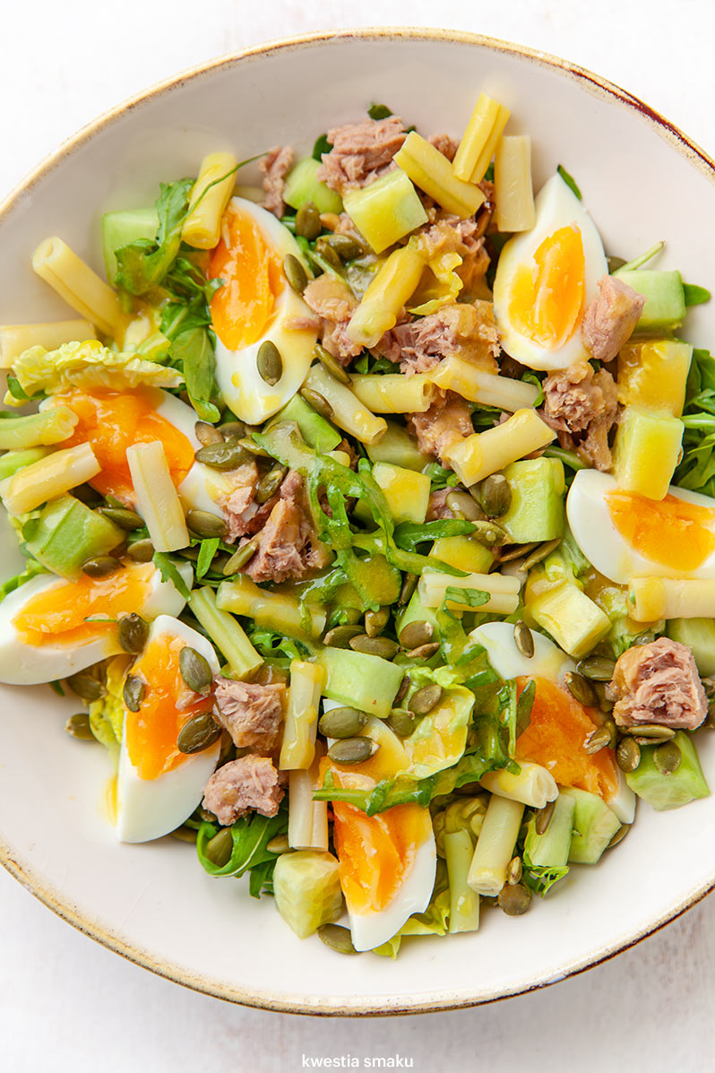 Bardzo smaczna i uniwersalna sałatka, z dodatkiem tuńczyka, ugotowanych jajek, fasolki szparagowej i ogórka. Z pestkami dyni oraz winegretem z dodatkiem miodu i musztardy miodowej. Dobra na kolację lub lunch. W zimie używam do niej mrożonej fasolki szparagowej, ale świetnie sprawdzi się też brokuł.