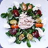 - W salaterce ułożyć roszponkę, pokrojonego w większe kawałki pomidora i drobno posiekaną cebulę. Doprawić solą.