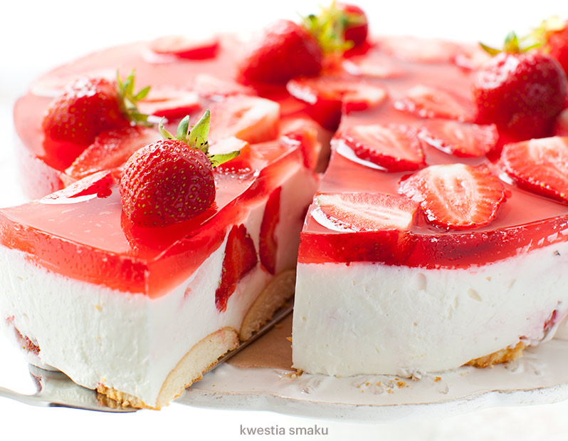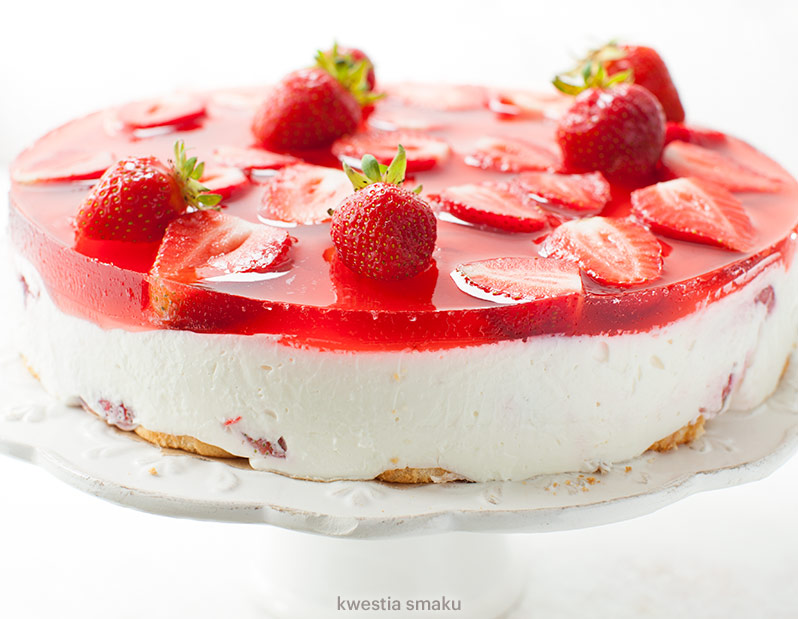 Klasyczny sernik na zimno, na biszkoptach z galaretką oraz truskawkami. Lekki i orzeźwiający. Taki sernik, choć zawiera kilka podstawowych składników, zawsze jest mile widziany przez gości i szybko znika ze stołu. Świetnie sprawdza się jako pomysł na słodkie zakończenie grilla lub letniego przyjęcia w ogrodzie. Lub po prostu jako niedzielny deser dla całej rodziny czy przyjaciół.