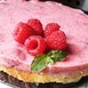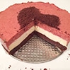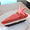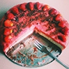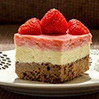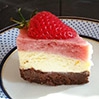 - Na ostudzoną masę serową wyłożyć tężejący mus truskawkowy i wstawić do lodówki do całkowitego stężenia (ok. 2-3 godziny lub na całą noc). Pokroić na porcje i udekorować połówką truskawki.