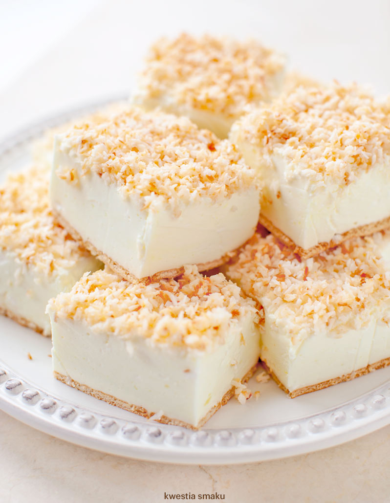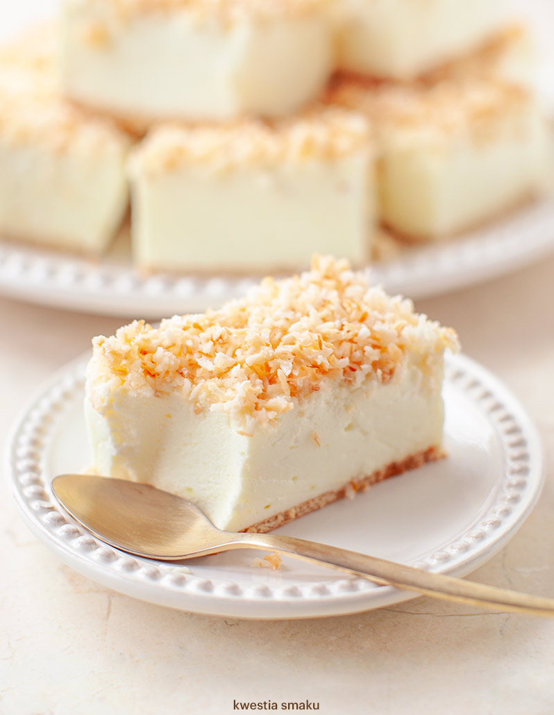 Proste ciasto bez pieczenia (a może bardziej sernik na zimno) o delikatnym cytrynowym smaku, którego bazą jest zmielony twaróg sernikowy. W połączeniu z galaretką cytrynową i śmietanką otrzymujemy kremowy i delikatny krem przypominający ptasie mleczko. Ciasto nie jest zbyt słodkie, bo zarówno galaretka cytrynowa jak i twaróg bardzo dobrze równoważą smak deseru. Ciasto jest na bazie herbatników, na wierzchu zaś ma przepyszną warstwę zrumienionych z cukrem i masłem wiórków kokosowych. Polecam do wypróbowania!