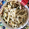 - Oddzielnie ugotować makaron zgodnie z instrukcją na opakowaniu.