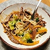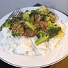 Danie kuchni chińskiej z woka, z cienko pokrojoną wołowiną i brokułami w gęstym sosie, podawane z ryżem.
