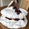 - Jeden blat położyć na paterze, wyłożyć połowę kremu, na wierzch położyć wiśnie i przykryć resztą kremu. Ułożyć drugi krążek bezy.