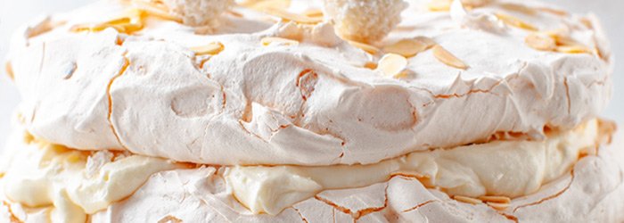 Tort bezowy Raffaello z kremem z białej czekolady, płatkami migdałowymi i wiórkami kokosa.