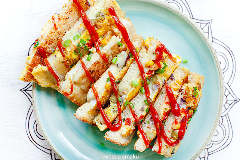 Tosty śniadaniowe z omletem, z kukurydzą i dodatkami, w wersji z szynką lub wegetariańskiej.