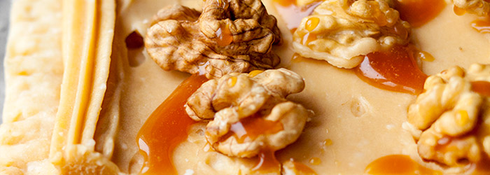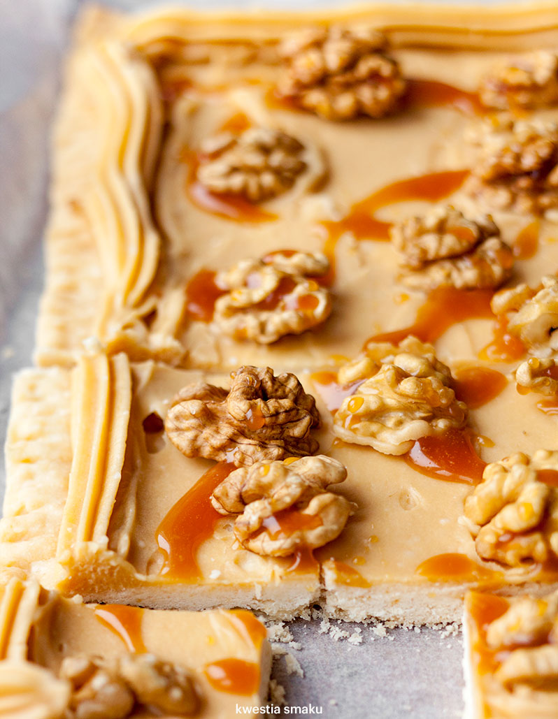 - Otrzymanym "kajmakiem" udekorować spód mazurka, część można wycisnąć szprycą, resztę rozsmarować na spodzie. Udekorować orzechami włoskimi i skropić odłożoną polewą toffee. Można przechowywać przez kilka dni poza lodówką.