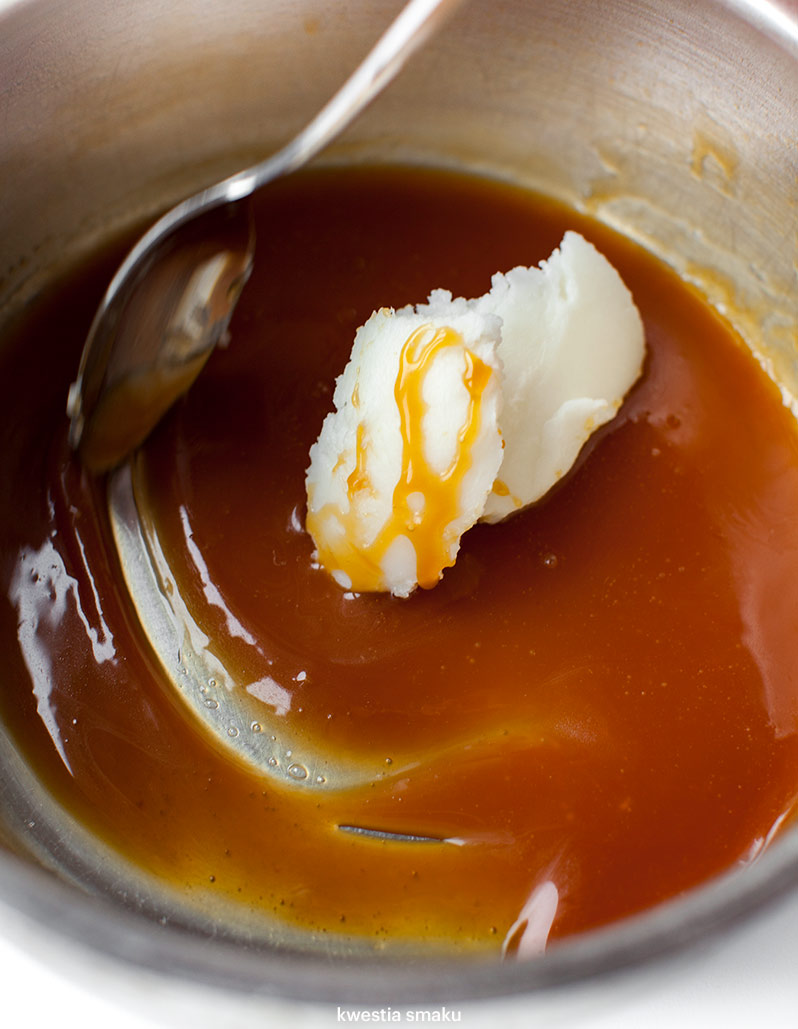 - Odłożyć 1/8 szklanki otrzymanej masy (na polewę toffee) a do reszty zimnej polewy dodać chłodny (stały) olej kokosowy, krótko zmiksować np. blenderem na gładką masę.