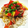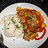 - Wyłożyć danie na talerze, obok położyć ryż, posypać szczypiorkiem oraz kolendrą (dla chętnych).