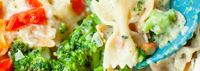- Połączyć z makaronem i brokułami w garnku, wyłożyć do naczynia żaroodpornego, po wierzchu posypać pokrojonym w kosteczkę pomidorem lub czerwoną papryką lub też pomidorkami przekrojonymi na połówki. Następnie posypać serem i wstawić do piekarnika bez przykrycia na 15 minut.