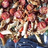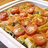 - Następnie położyć pokrojonego na kawałki łososia wędzonego i lekko wcisnąć go w makaron. Na wierzchu ułożyć połówki pomidorków koktajlowych, doprawić solą i pieprzem i wstawić do nagrzanego piekarnika (funkcja grilla w piekarniku na średnią moc lub 200 stopni C).