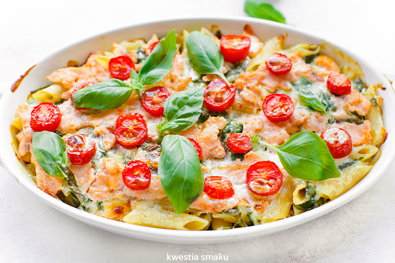 kwestiasmaku Zapiekanka makaronowa z łososiem wędzonym i szpinakiem