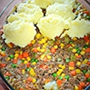 - Dodać mąkę uprzednio rozprowadzoną w kilku łyżkach wody lub wywaru, dodać warzywa mrożone i kukurydzę, wymieszać i po zagotowaniu wyłożyć do żaroodpornej formy. Pokryć purée ziemniaczano - pietruszkowym i posypać papryką w proszku. Piec przez 30 minut w 200 stopniach C.
