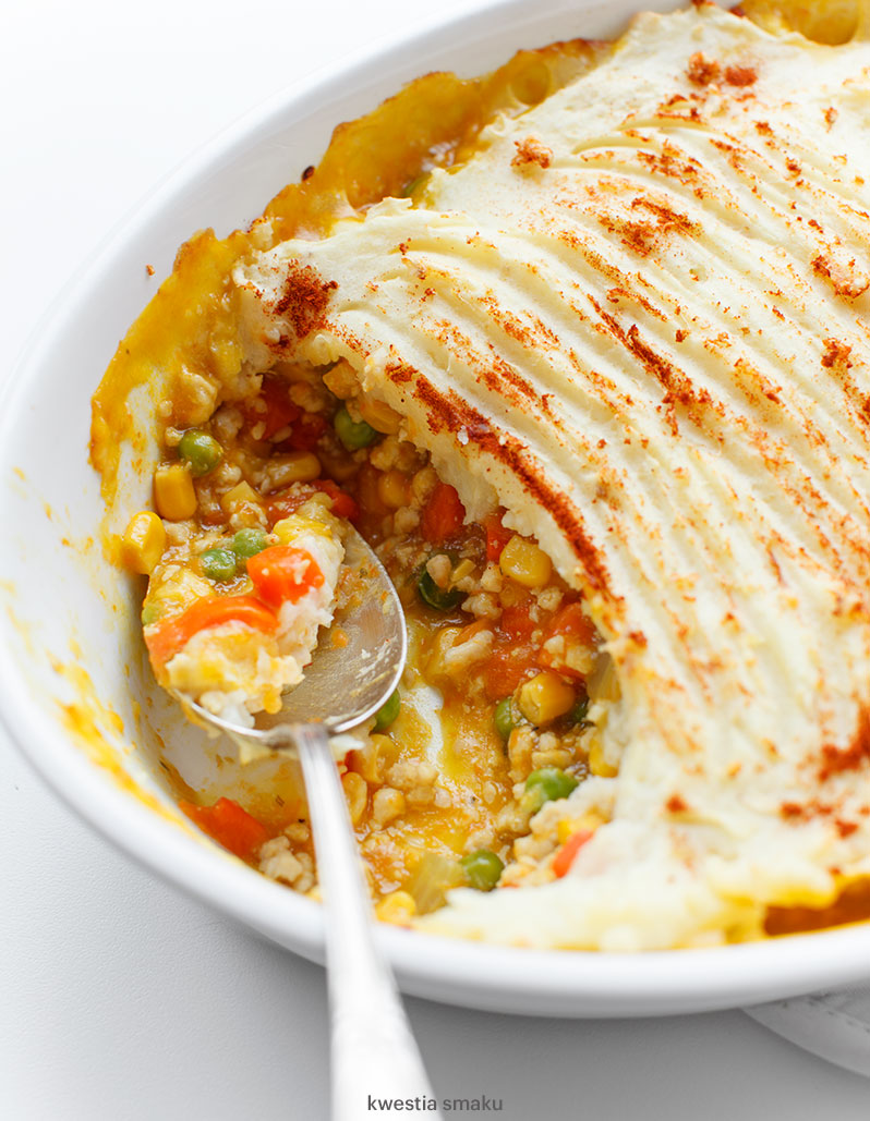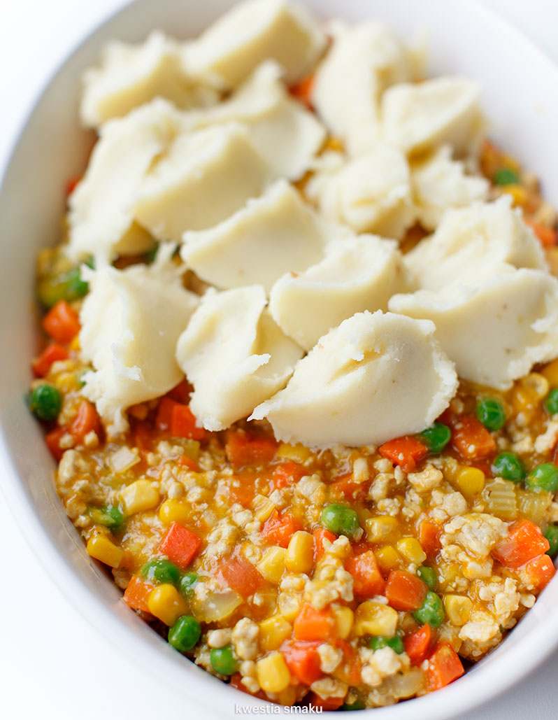 Lekka i delikatna w smaku zapiekanka z mielonego mięsa indyka, dużej ilości warzyw oraz warstwy ziemniaków i pietruszki rozgniecionych na purée. Oprócz zeszklonej cebuli zawiera seler naciowy, marchewkę (zarówno startą jak i pokrojoną w kosteczkę), groszek i kukurydzę. Ze względu na łagodne doprawienie, zapiekanka powinna posmakować dzieciom, szczególnie tym, które lubią kolorowe jedzenie ;-)