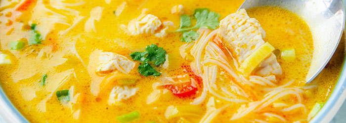 Zupa azjatycka z kurczakiem i cieniutkim makaronem sojowym, z mlekiem kokosowym, limonką oraz słodkim sosem chili.