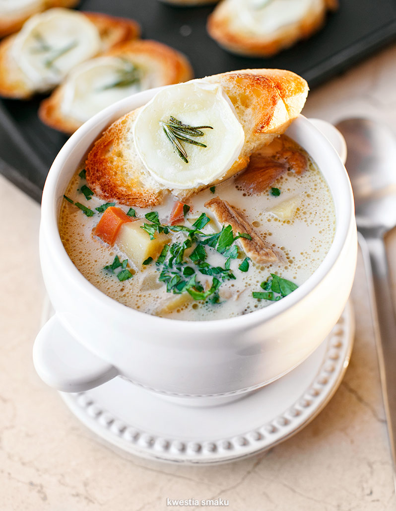 - Odstawić z ognia i wlać śmietankę, w razie potrzeby doprawić solą i pieprzem. Podawać z natką pietruszki oraz grzankami lub łazankami.