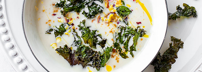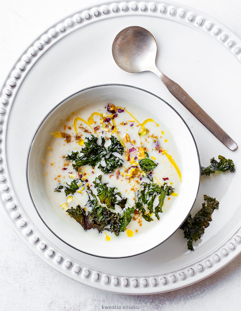 - Podawać z chipsami z jarmużu oraz posiekanymi obranymi pistacjami (opcjonalnie). Można też skropić oliwą.