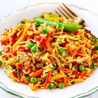 Łosoś teriyaki z ryżem, fasolką i kukurydzą