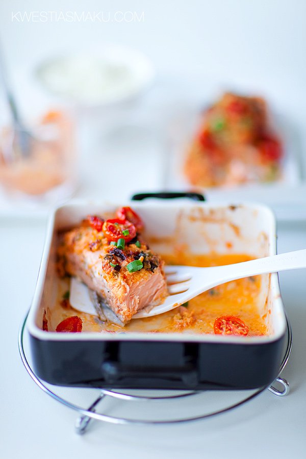 admin Łosoś zapiekany z czerwonym pesto, pomidorkami koktajlowymi i jogurtem