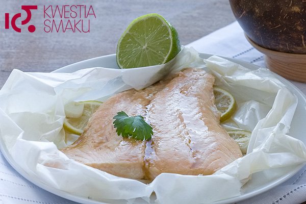 - Z papieru do pieczenia wyciąć 2 prostokąty. Na każdym ułożyć plasterki limonki i czosnku, przykryć filetem z łososia i polać sosem. Zawinąć papier dookoła ryby tworząc paczuszkę lub zwinąć papiloty w kształt cukierka.