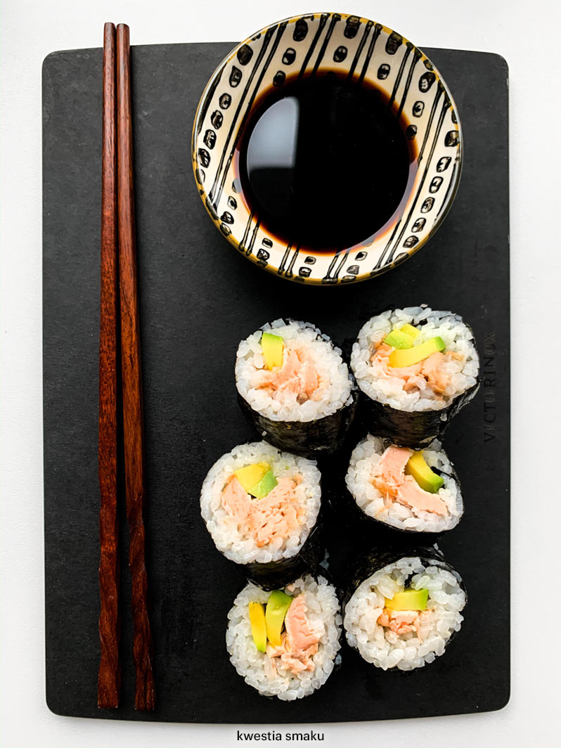 Nie mogę sobie jednak odmówić zrobienia sushi w domu, bo jest to przecież proste, relatywnie tanie i smaczne. Wybieram bezpiecznego, pieczonego łososia teriyaki. Łosoś ma być soczysty i nie przesuszony. Ciemny sos pozostały z pieczonego łososia mieszam z niewielką ilością majonezu i dodaję do środka (można go też zredukować i polać nim gotowe maki). Z dodatków polecam ogórek lub awokado, zrumieniony sezam. Robię też „tatara” z pieczonego łososia z dodatkiem posiekanego pora, imbiru i szczypiorku i kładę go na zwiniętych rolkach. Sprawdźcie w sklepach jak łatwo można dostać potrzebne składniki i zróbcie swoje domowe sushi :-)