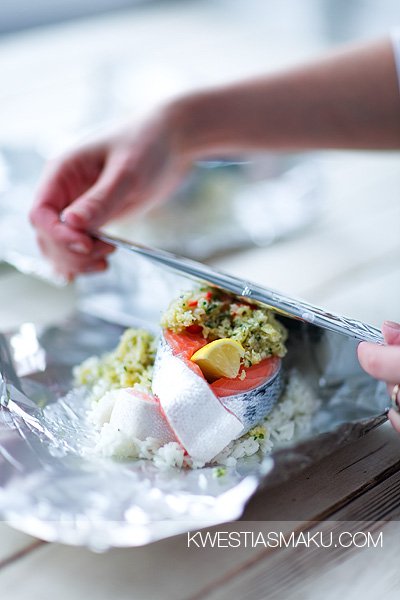 - Na ryż wyłożyć połowę ilości kokosowej mieszanki, następnie dodać dzwonka łososia, a na wierzch wyłożyć resztę mieszanki. W środek dzwonka wcisnąć po kawałku wyciśniętej cytryny, zawinąć filię tworząc tzw. "papiloty". Ułożyć je na małej blaszce do pieczenia i wstawić do nagrzanego piekarnika.