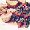 Potrawa bardzo letnia, polecam ją szczególnie na upalne dni. Przegrzebki smaży się na patelni przez 2 minuty i podaje ułożone na salsie pomidorowej. Surowe pomidory doprawione są dużą ilością świeżych ziół, oliwą i czosnkiem.
