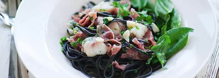 admin Czarny makaron z żabnicą, szynką parmeńską i szczawiem