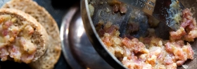 Kanapeczki razowe z chudym boczkiem, cebulką i masłem.