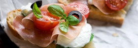 Bruschetta z mozzarellą, szynką parmeńską i pomidorkami koktajlowymi