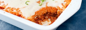 Warzywna zapiekanka z soczewicą i purée z kalafiora i batatów