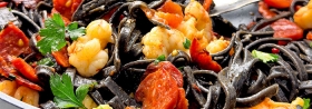 Czarny makaron z chorizo i krewetkami