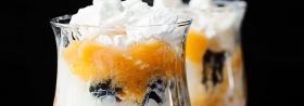 Deser w pucharkach z bezą, lodami, jeżynami i musem brzoskwiniowym